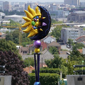 Déjà repérée en deuxième couronne de la banlieue parisienne pour son très pointu musée d’art contemporain, le Mac/Val, Vitry-sur-Seine, l’une des soeurs jumelles du noyau dur du communisme municipal, les inséparables Ivry-Vitry, fiefs des grands chefs du parti communiste du temps où il était puissant et stalinien, Vitry donc est aussi cette cité qui vous accueille sur la quasi autoroute qui la traverse par une superbe et géante tour-statue bleu-blanc-rouge de Dubuffet au centre d’un rond-point. Le signal qui vous avertit que vous arrivez ici sur un territoire qui est littéralement un musée en plein air d’art contemporain.