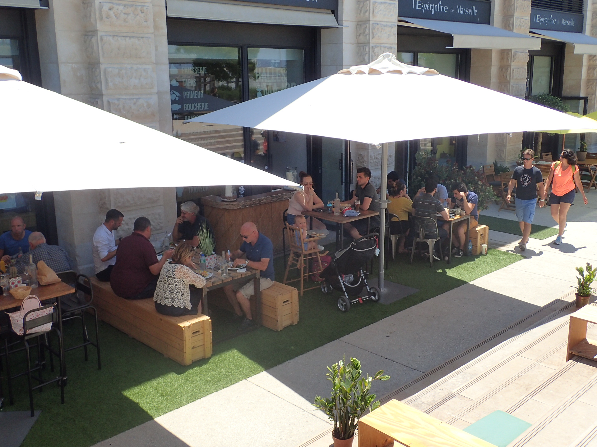Alain Siffrein-Blanc qui appartient à la nouvelle génération des entrepreneurs marseillais a eu l’idée de créer aux Halls de la Major un lieu un peu particulier. Celles-ci regroupent de multitudes étales : charcutier, poissonnier, primeur, pâtissier et un vaste restaurant. Au Café des Docks, on s’installe à son gré, sur une de ces longues tables d’hôtes. Ensuite chacun fait son marché entre les étales. Produits frais, mitonnés à la demande, de belles assiettes composées. .. Le choix est large : tartare de saumon, de daurade, salade de poulpe, carpaccio de St Jacques, loup au four, tomates bufala di campant, taboulé de Quinca … jusqu’à d’excellentes pizzas et spécialités vietnamiennes. Initiative originale et bienvenue, une animatrice invite les enfants qui le souhaitent à rejoindre un espace de jeux.