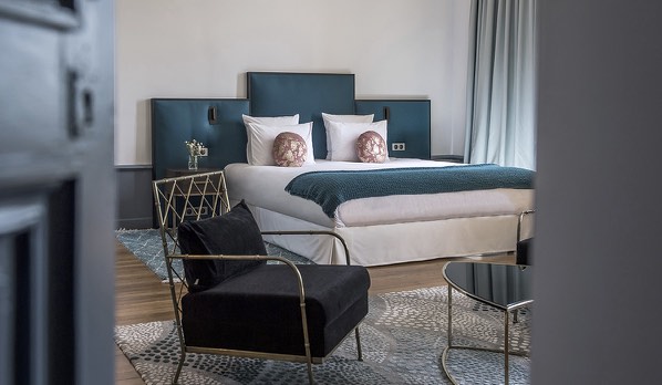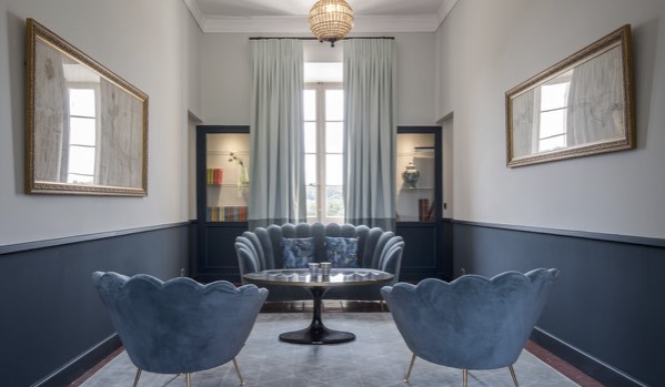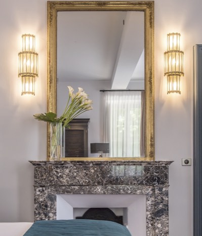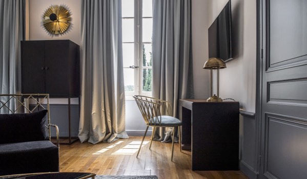 7 chambres et suites, de 200 à 370 € la nuit, décorées dans un style néo-classique avec des salles de bains « Belle Epoque » ont été créées dans le Châteaux avec donc de beaux volumes et les hauteurs sous plafond en rapport.